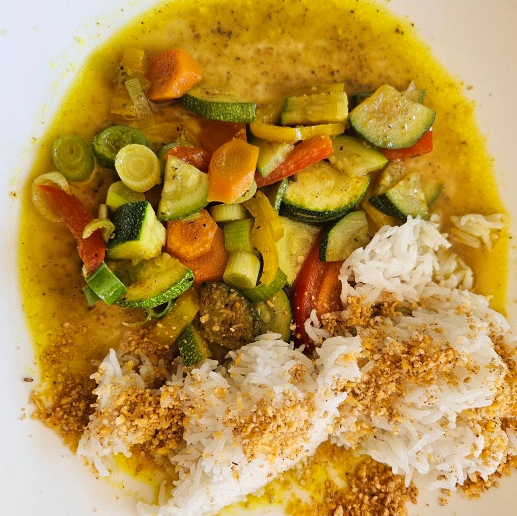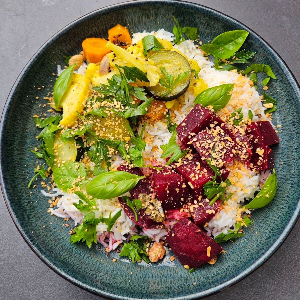 rote Bete mit Basmati und anderem Gemüse der Saisson, dazu frische Kräuter